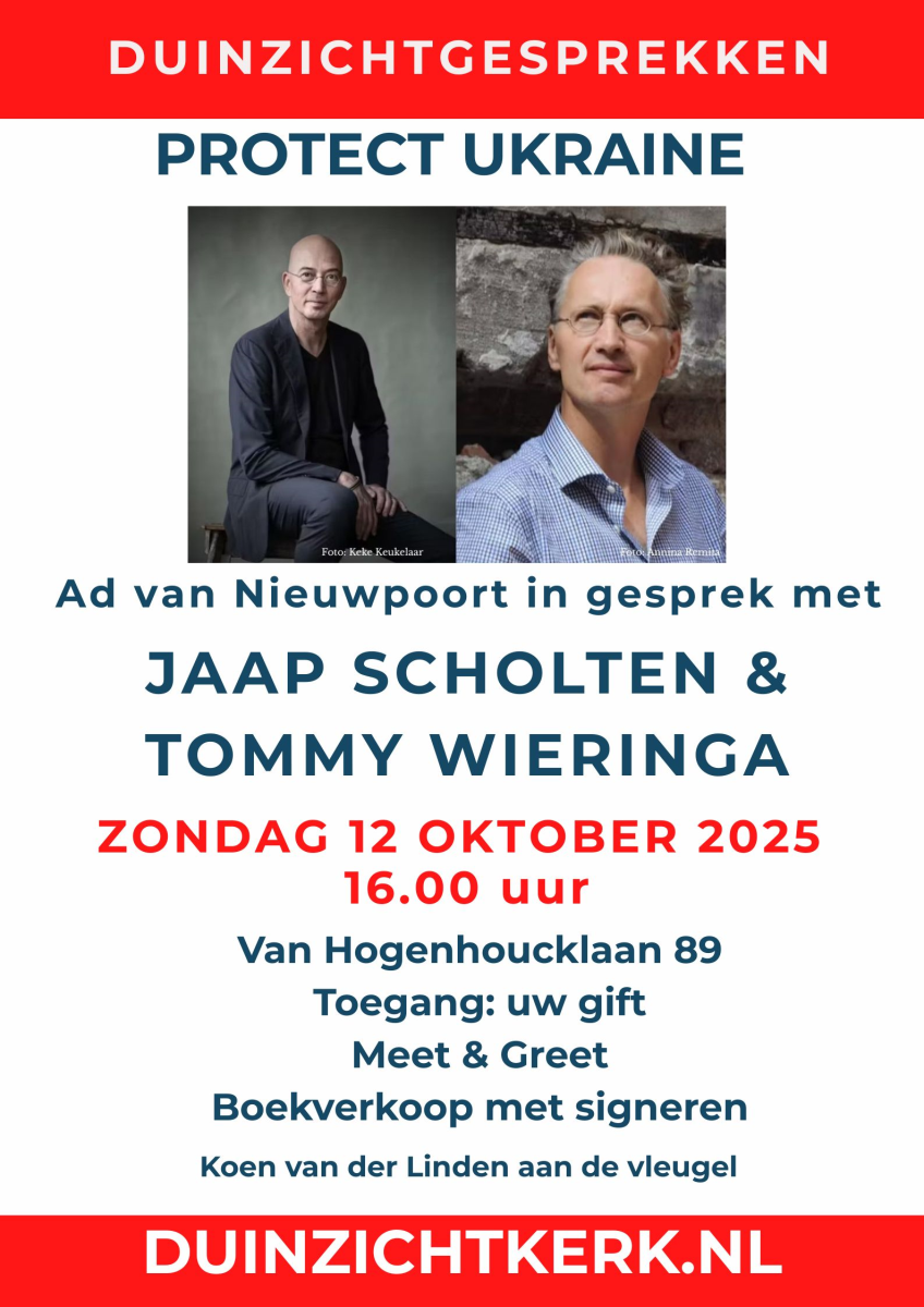 ![]() Kijk hier het indringende gesprek over de oorlog in Oekraine terug Tommy Wieringa en Jaap Scholten in de Duinzichtkerk Op zondag 12 oktober gaat Ad van Nieuwpoort in zijn serie Duinzichtgesprekken in gesprek met de schrijvers Tommy Wieringa en Jaap Scholten over hun project Protect Ukraine. Beide schrijvers hebben meteen na de Russische inval in Oekraïne zich persoonlijk het lot aangetrokken van de Oekraïense bevolking. Met regelmaat van de klok gaan zij met een konvooi daar naartoe om voertuigen en beschermingsmiddelen te brengen naar Oekraïense legereenheden. ‘Nu kunnen we de tirannie daar nog tegenhouden’, zo zegt de in Hongarije wonende Jaap Scholten, ‘in mijn land kan dat al niet meer’. Vorig jaar verscheen van de hand van bestsellerauteur Tommy Wieringa het boek ‘Konvooi. Reizen naar een land van oorlog’. Een aangrijpend verslag van wat hij meemaakt tijdens de verschillende reizen naar Oekraïne in oorlog. Hij staat daarmee in de traditie van schrijvers als Joseph Roth en Isaak Babel die ook verslag deden van eerdere oorlogen in datzelfde gebied. Van Jaap Scholten verschijnt deze dagen ‘Nastya in Charkiv. Naar de frontlinie van Europa’ met foto’s van Eddy van Wesel. Beide boeken zijn na afloop verkrijgbaar. De opbrengst is voor Protect Ukraine. Voor donaties kunt u kijken op www.protectukraine.nl |