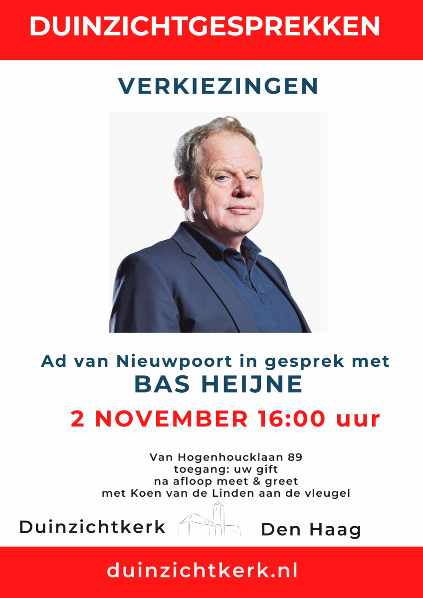 ![]() Bas Heijne over de uitslag van de verkiezingen Op zondag 2 november gaat Ad van Nieuwpoort in zijn serie Duinzichtgesprekken in gesprek met essayist Bas Heijne over de uitslag van de verkiezingen. Bas Heijne schreef in aanloop naar de verkiezingen een boeiend essay over de Atheense staatsman Perikles (ca. 495-429) en zijn lessen voor de democratie. De democratie is er op dit moment niet best aan toe, zo constateert Heijne. Het is ‘een slangenkuil, een kruitvat en een kooigevecht’. En daarin vormt onze democratie grote overeenkomsten met het oude Athene. Wat zijn de lessen die Perikles ons leert, ook als we de verkiezingen van 29 oktober evalueren? Zondag 2 november om 16 uur in de Duinzichtkerk, Hogenhoucklaan 89 in Den Haag. Achter de vleugel Koen van der Linden en met na afloop meet&greet en signeren. Toegang: uw gift. |