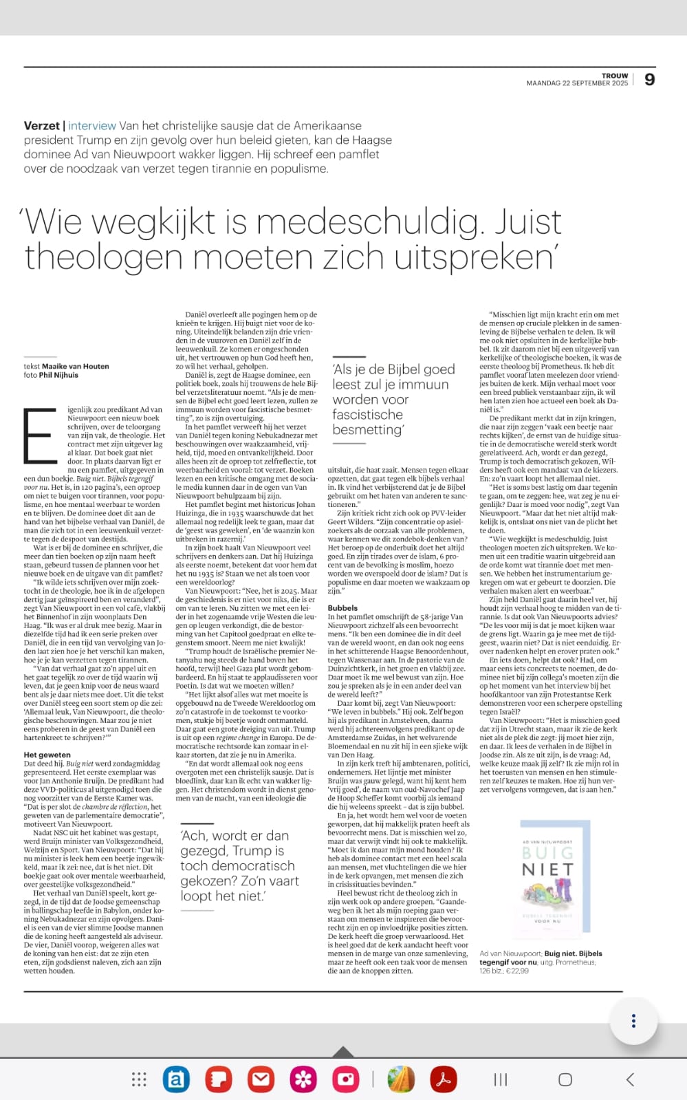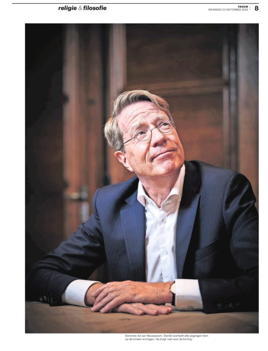 ![]() In Trouw vandaag, maandag 22 september 2025, een interview met Ad van Nieuwpoort over zijn gisteren verschenen boek ' Buig niet', Bijbels tegengif voor nu. Naar aanleiding van het boek Daniel duidt Van Nieuwpoort de hedendaagse tijd en geeft de lezer een achttal opdrachten mee. Lees hier in pdf ![]() |